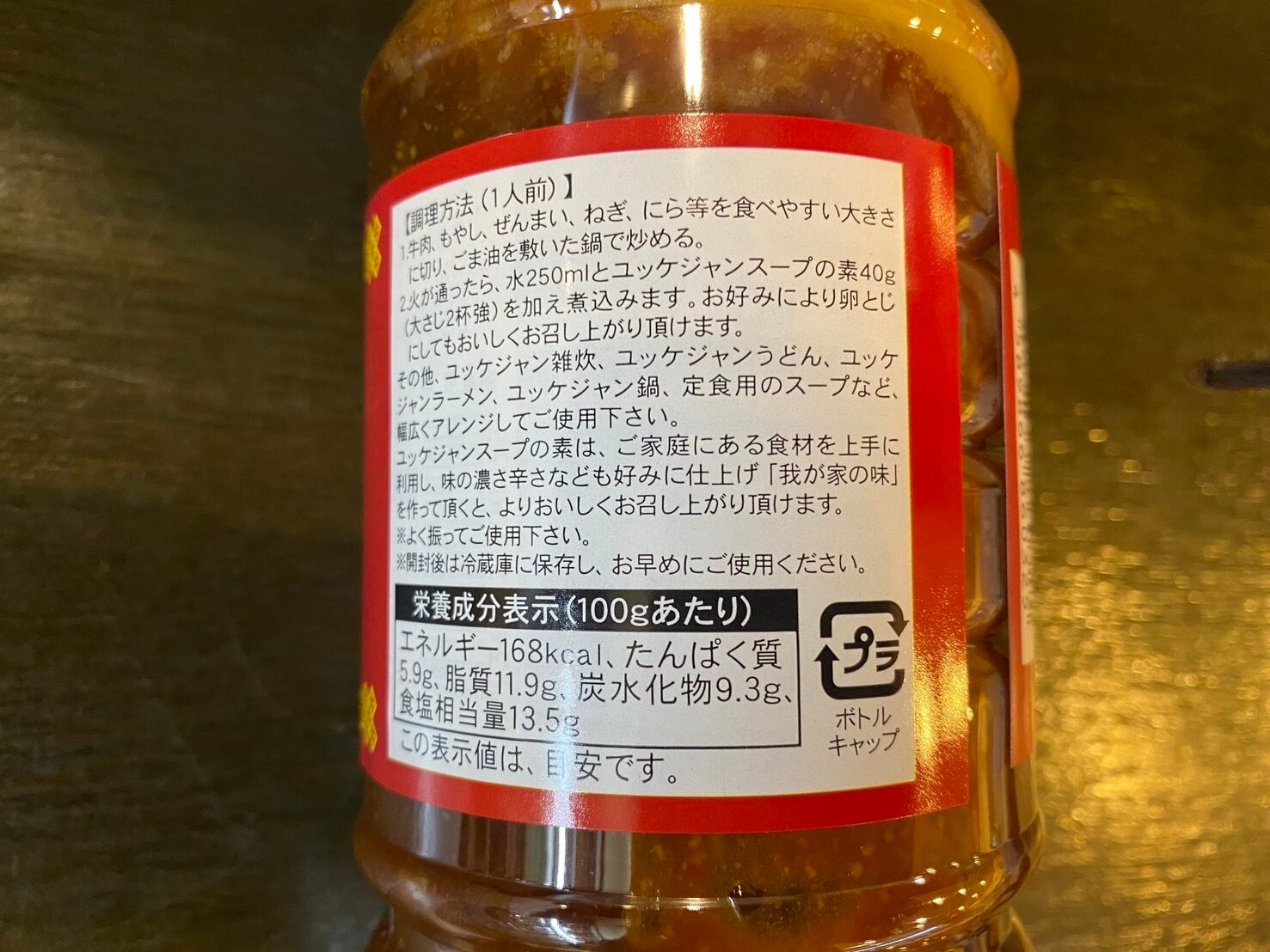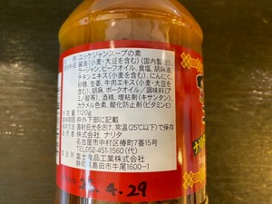 ラージャン、ビーフオイル、食塩、胡麻油、チキンエキス(小麦を含む)」にんにく、砂糖、生姜、牛肉エキス(小麦・大豆を含む)、胡麻、ポークオイル/調味料(アミノ酸等)、酒精、増粘剤(キサンタン)、カラメル色素、酸化防止剤(ビタミンE)